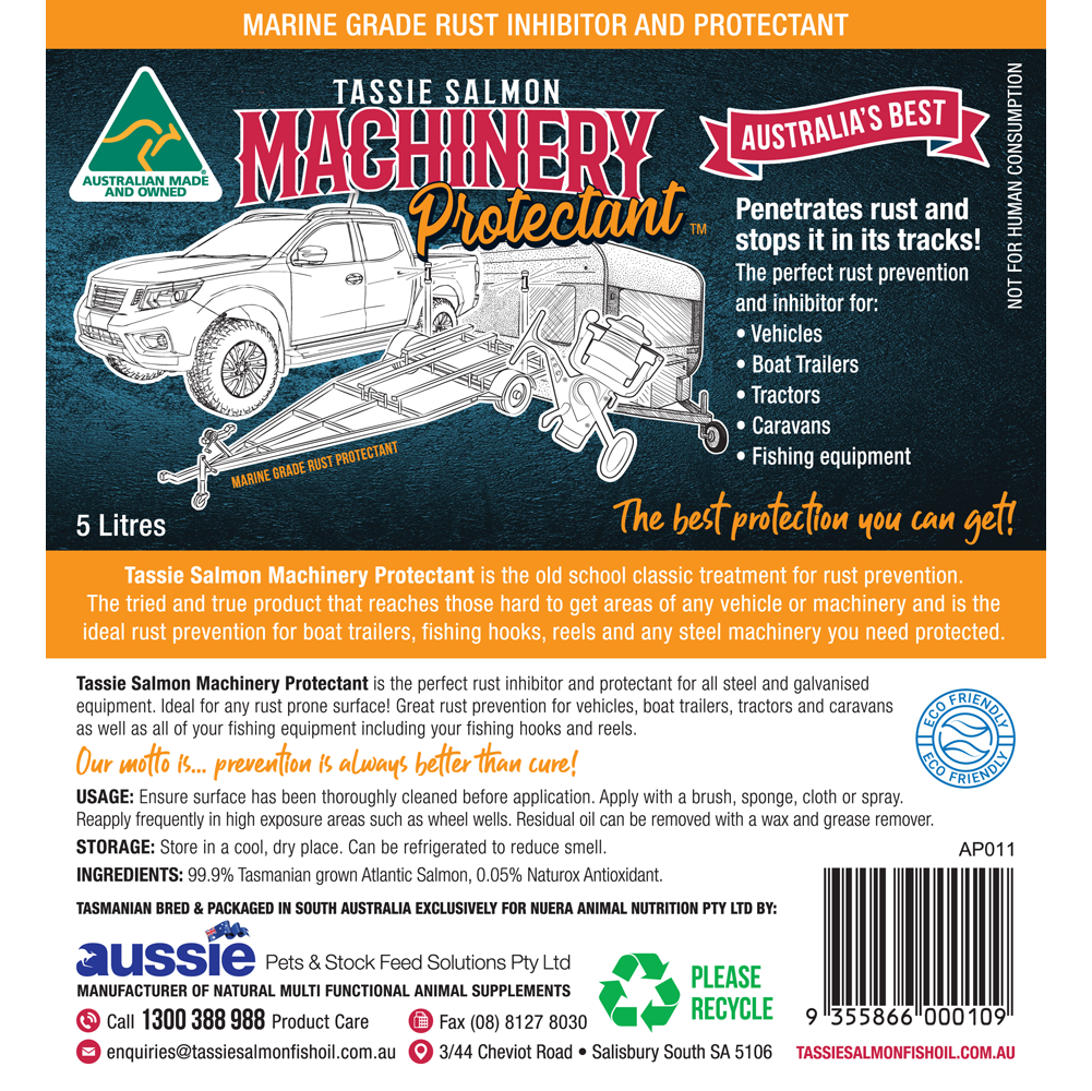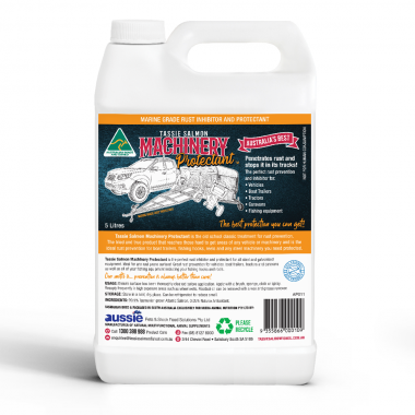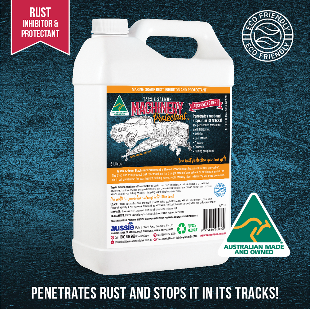 Tassie Salmon Machinery Protectant is the old school classic treatment for rust prevention. Whether you are protecting your cars, 4wds, trucks, boat, trailers, caravans, machinery, tools or have to loosen rusted bolts our Tassie Salmon Marine Grade Rust Inhibitor and Protectant is what you need. It's a natural non-toxic rust inhibitor treatment that is easy to use, highly effective and the best way to keep any steel and galvanized items protected. Tassie Salmon Machinery Protectant is perfect for hard to reach areas, penetrates rust and stops it in its tracks!