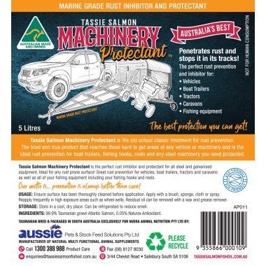 Our Tassie Salmon Marine Grade Rust Inhibitor and Machinery Protectant is sourced from 100% Tasmanian Atlantic Salmon farmed in the Pristine waters of Tasmania and produced in a state-of-the-art Salmon facility using Industrial high sustainable growing practices.