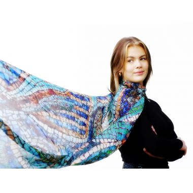 100% Pure Silk Chiffon Scarf 180cm x 65cm The Chiffon Scarf is 8mm (35gms per square metre) in the silk weight scale, has a plain weave and is feather light and sheer whilst still maintaining the strength and lasting qualities of pure silk. Included with your scarf is a Designed Bluyonda box with magnetic lid / tag with the story about the image / tag with history of Silk and Artist's resume