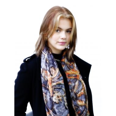 100% Pure Silk Tabbi Scarf 150cm x 50cm The Tabbi Scarf is 5mm (22gms per square metre) in the silk weight scale, has a plain weave and is feather light and sheer whilst still maintaining the strenth and lasting qualities of pure silk. Included with your scarf is a Designed Bluyonda box with magnetic lid / tag with the story about the image / tag with history of Silk and Artist's resume