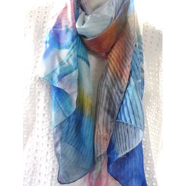 100% Pure Silk Tabbi Scarf 150cm x 50cm The Tabbi Scarf is 5mm (22gms per square metre) in the silk weight scale, has a plain weave and is feather light and sheer whilst still maintaining the strenth and lasting qualities of pure silk. Included with your scarf is a Designed Bluyonda box with magnetic lid / tag with the story about the image / tag with history of Silk and Artist's resume