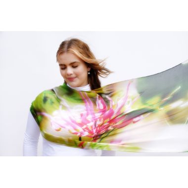 100% Pure Silk Chiffon Scarf 180cm x 65cm The Chiffon Scarf is 8mm (35gms per square metre) in the silk weight scale, has a plain weave and is feather light and sheer whilst still maintaining the strength and lasting qualities of pure silk. Included with your scarf is a Designed Bluyonda box with magnetic lid / tag with the story about the image / tag with history of Silk and Artist's resume