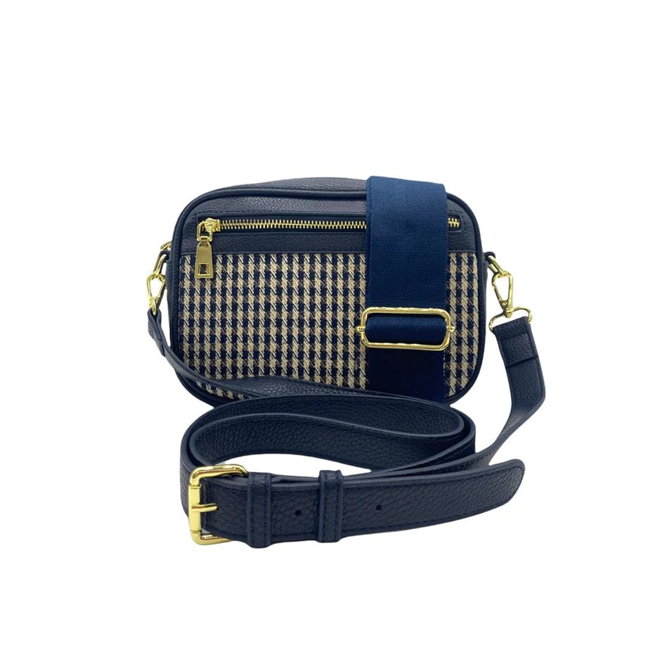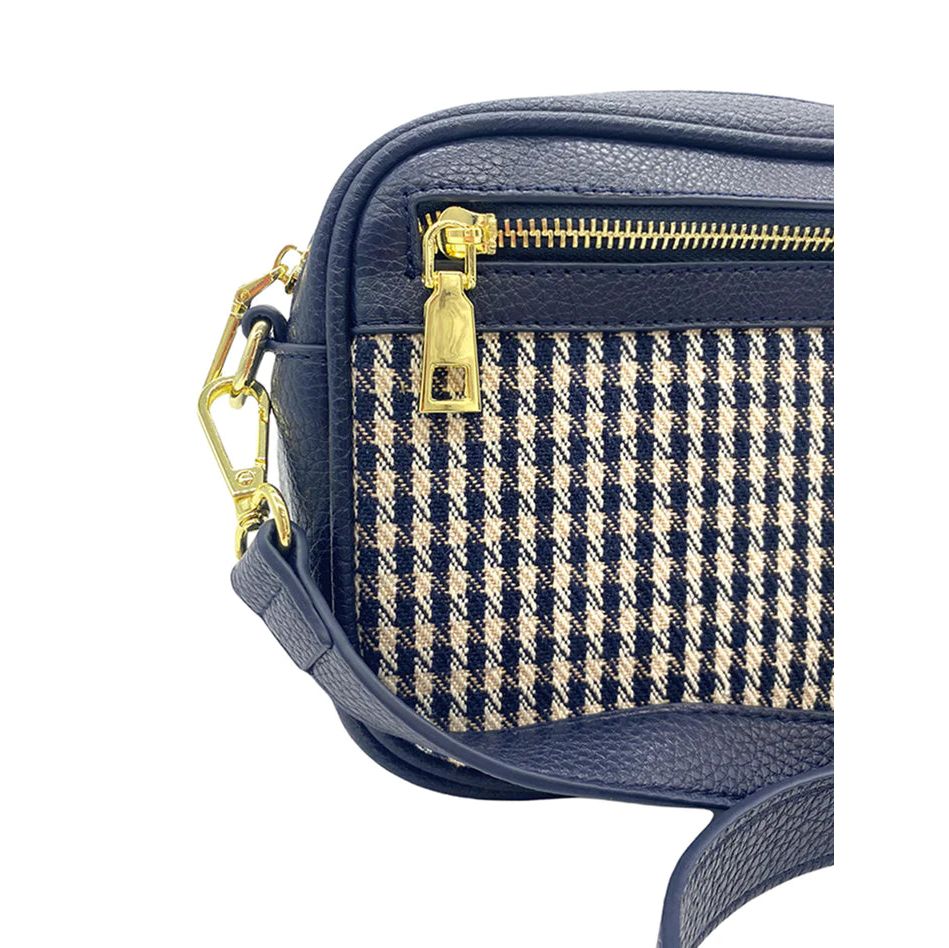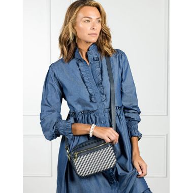 The Olly Cross Body is a nice riff on our classic Ruby Cross Body. The same shape and size, but with a panel of thick woven fabric in a sharp black and white check. The Olly comes with an adjustable plain black PU strap which is 2.5cm wide, as well as a wide black webbing strap which makes the bag more casual and sporty.