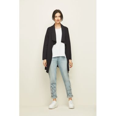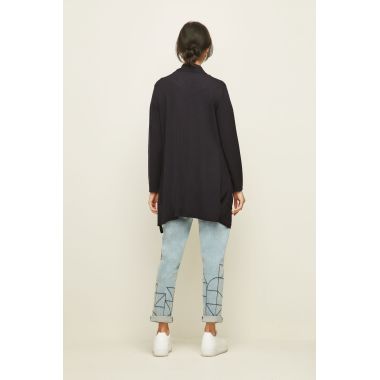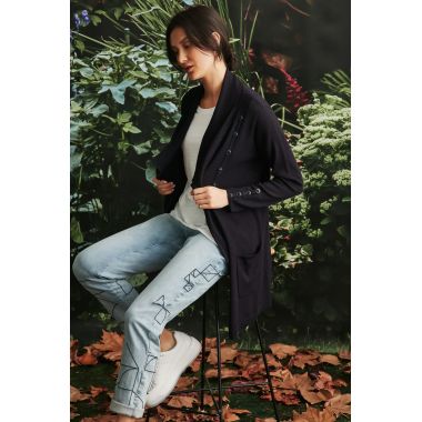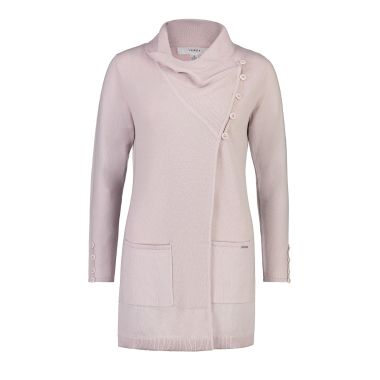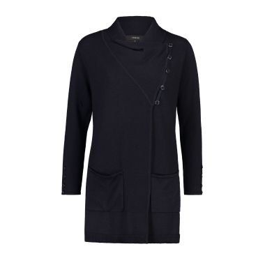 The Agent Cardi is a 100% Merino wool cardigan with cross over funnel collar. Functional deep front pockets. Exposed button and tape detail. Falls to mid thigh. Great layered with Liverpool sweater for a warmer option.