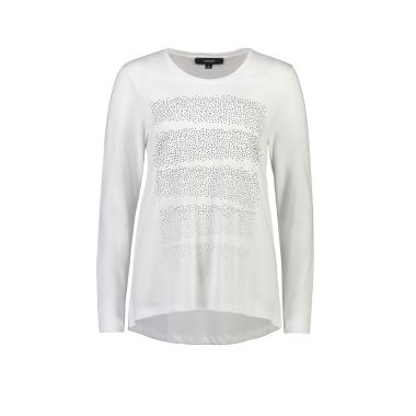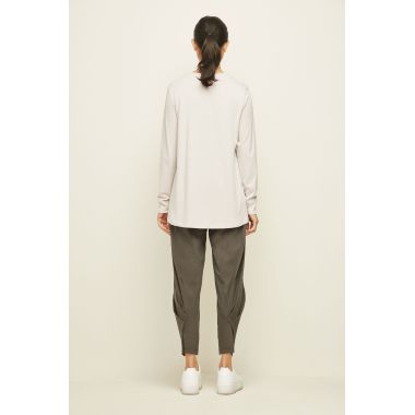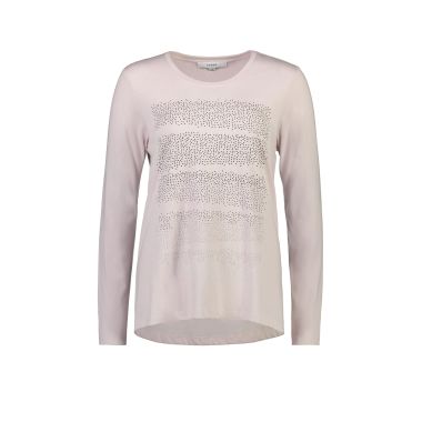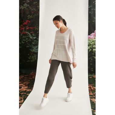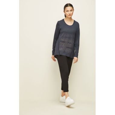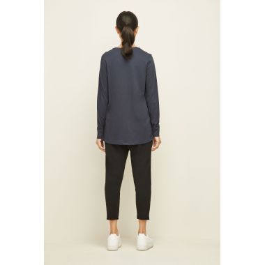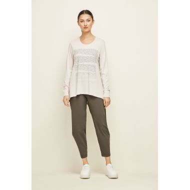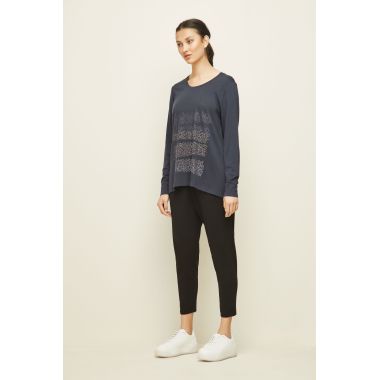 The Alana Top is a Soft Cotton/Modal fit and flare top with subtle hotfix design on the front panel. Round neckline and full length sleeves with cuff. The Alana top falls just below the hip.