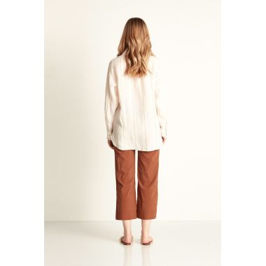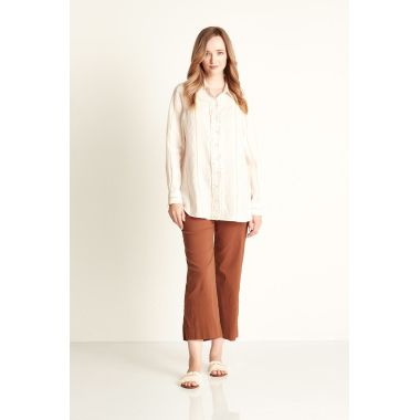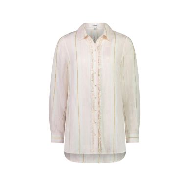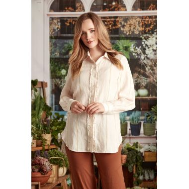 100% Linen longline button through shirt with collar. Striped linen. Subtle ruffle front detail. Bracelet length sleeve with button cuff. The Casey shirt falls below the hip. Curved hemline. |
