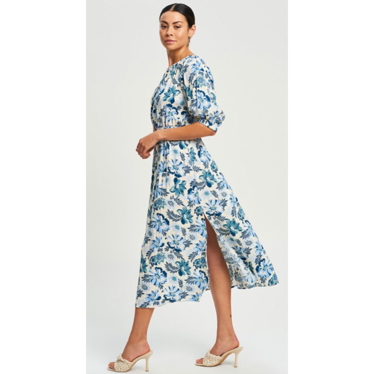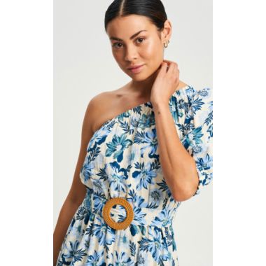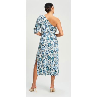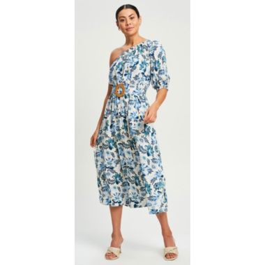 Featuring one shoulder design, Midi length dress printed in a blue floral fabrication, Adjustable waist belt; woven 'O' belt buckle & Side split detail.
