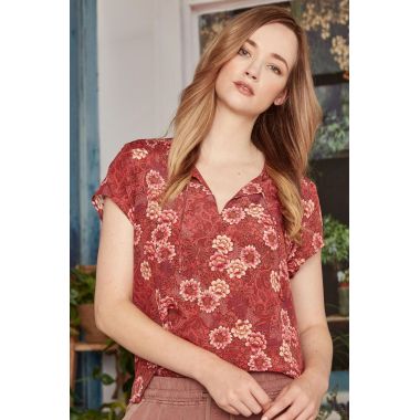 Cool Viscose crepe in exclusive Nostalgia print. The Nostalgia top features a V neckline with ties and shirring on the front shoulder. Drop shoulder sleeve. Curved hemline. Top falls to the hip. |