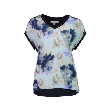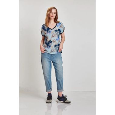 Our signature Silk tee with Modal jersey back in this season's soft focus Overcast print. The Overcast top features a V neck trimmed in rib with statement metallic thread edge which is repeated on the sleeve. V Neck. Relaxed fit. Dropped shoulder sleeve. Falls just below the hip.