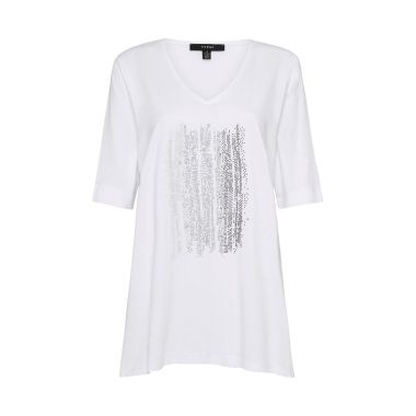 Soft drapey Cotton/Modal top with V neckline and elbow length sleeve. The Premise top features a graduated hotfix and foil print on the front panel. The Top falls below the hip.