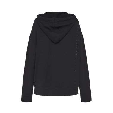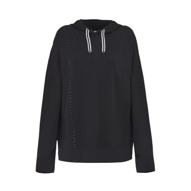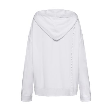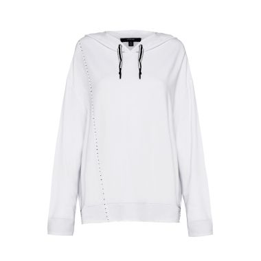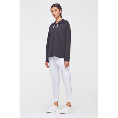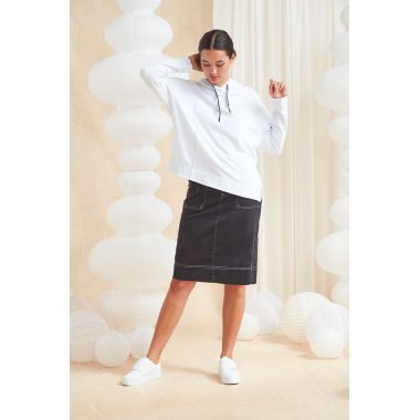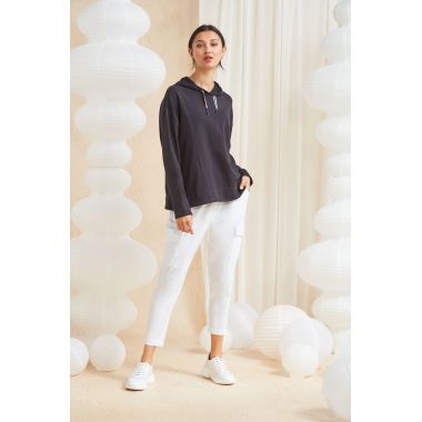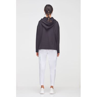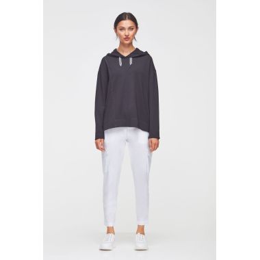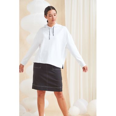 Contemporary styled Resound sweatshirt in soft stretch Cotton/modal. The Resound Sweatshirt features contrast blanket stitch detail on one side and a around the hemline. Sweatshirt is hooded and has a bracelet length sleeve.