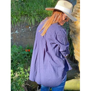 A beautiful light weight cotton shirt with sweet hail spot detailing. A tiny frill at the neck and sweet button closure at the neck make this blouse and ultra feminine piece you will love to wear this season.
