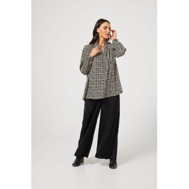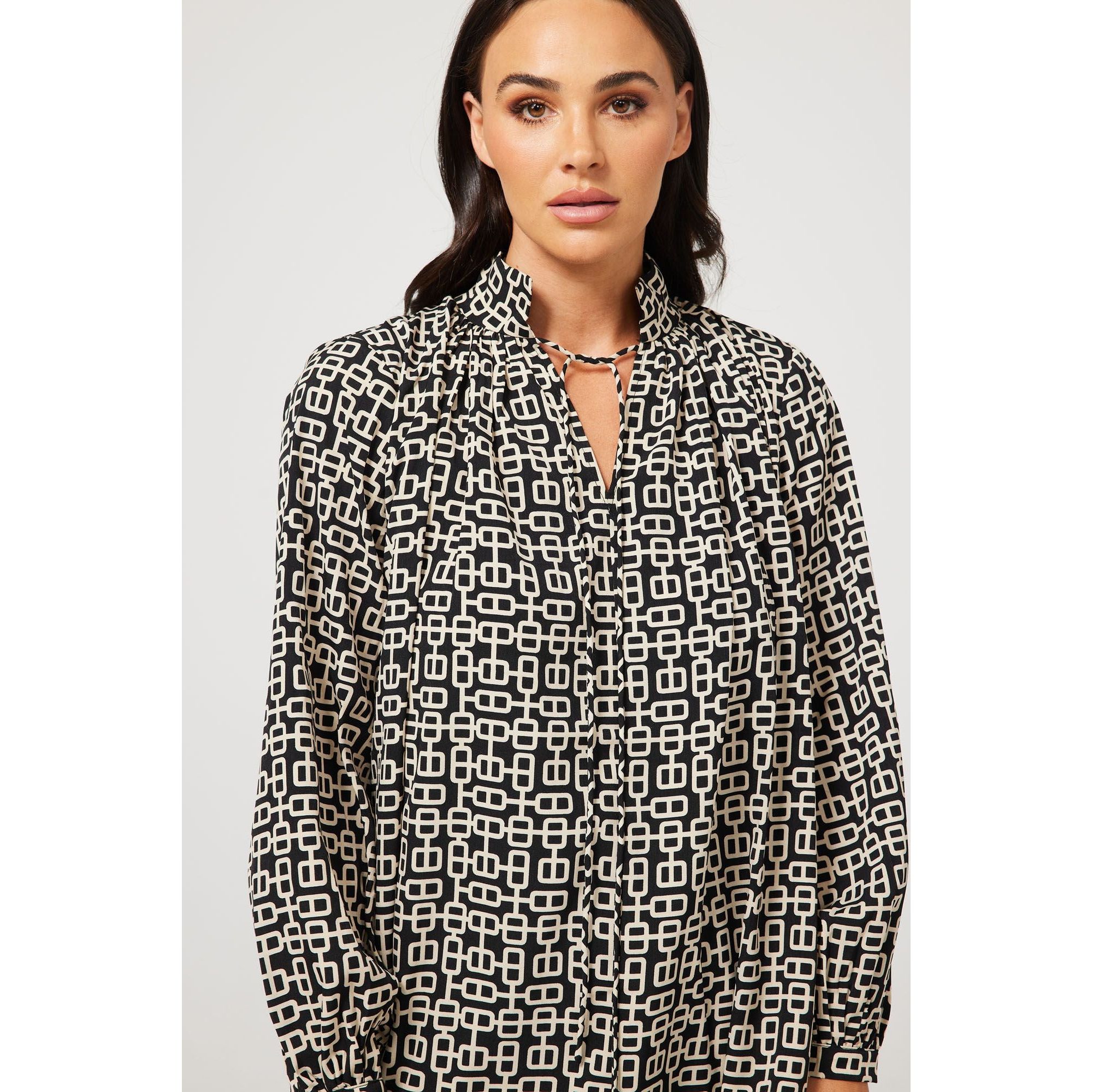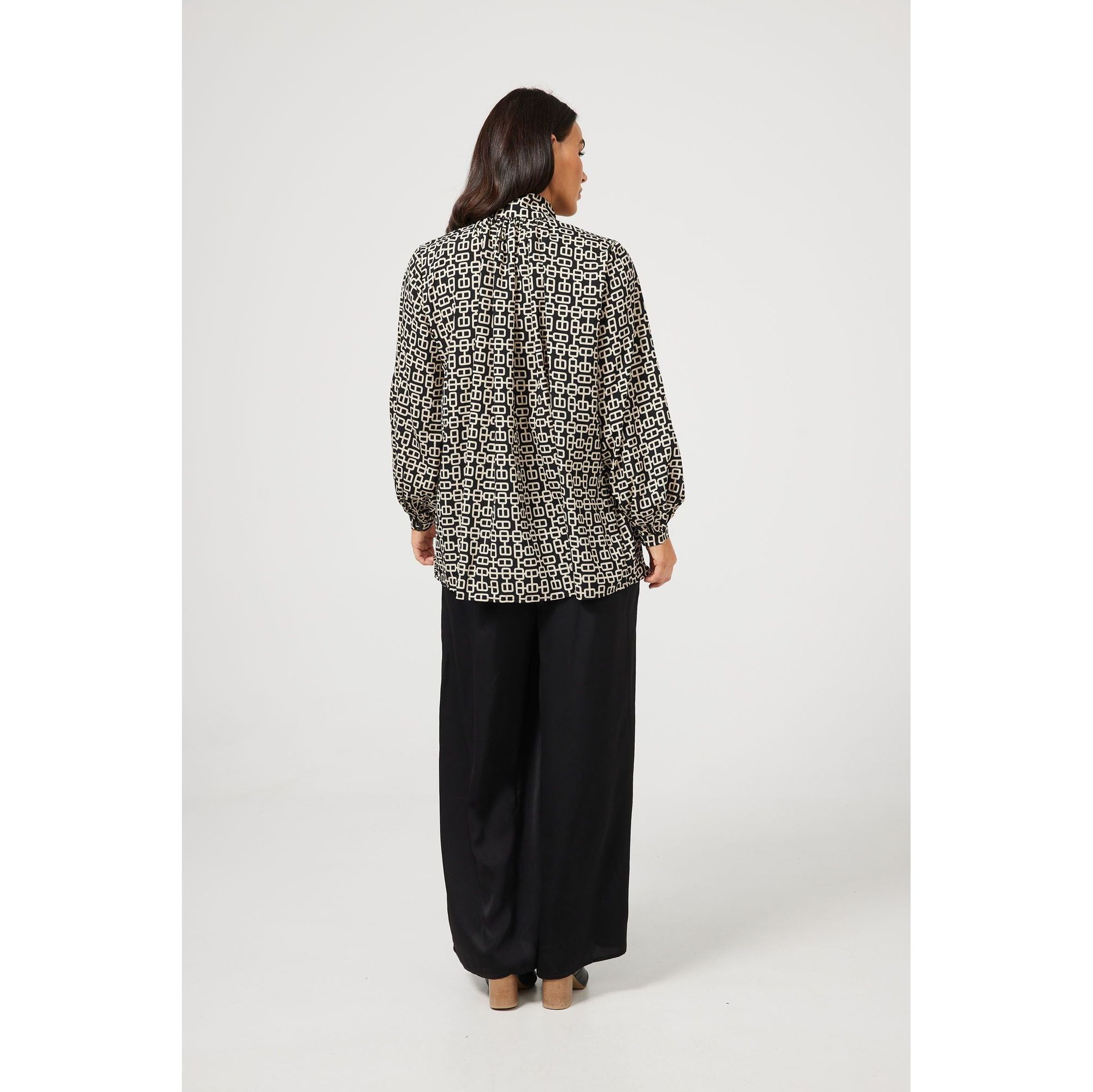 This gorgeous billowy shirt is a versatile addition to your wardrobe. It features a neck tie detail, narrow buttoned sleeve cuffs.