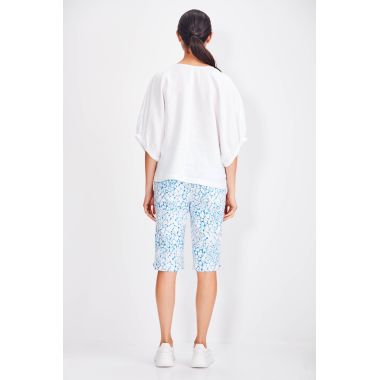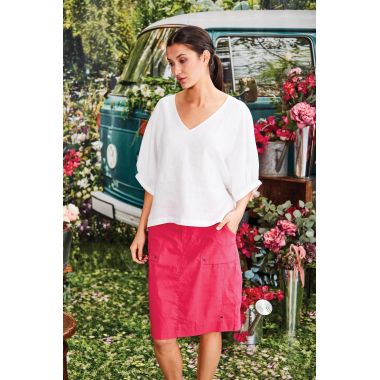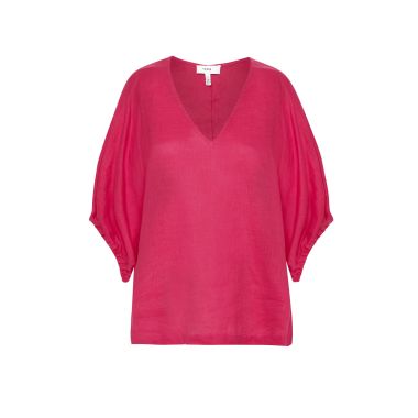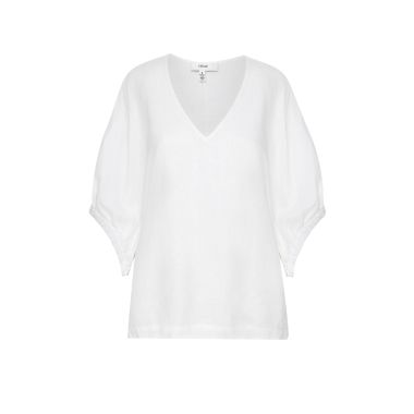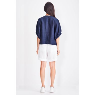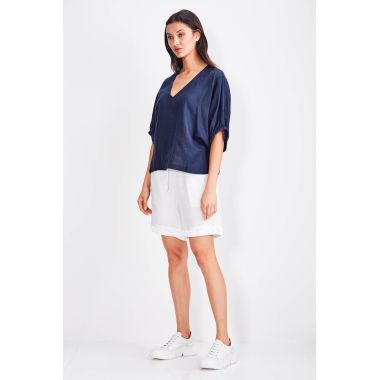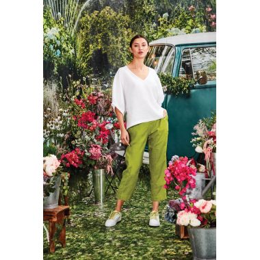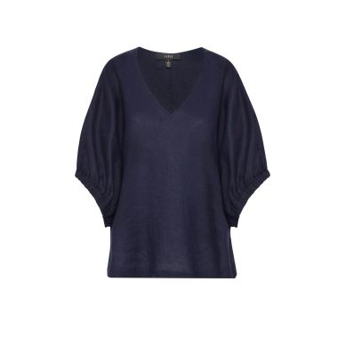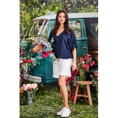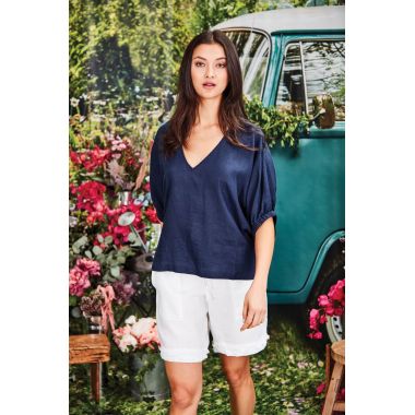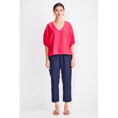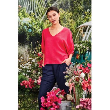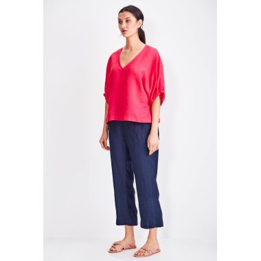 Contemporary styled 100% Linen with V neckline and drop shoulder dramatic sleeve finished in soft elastic cuff. |