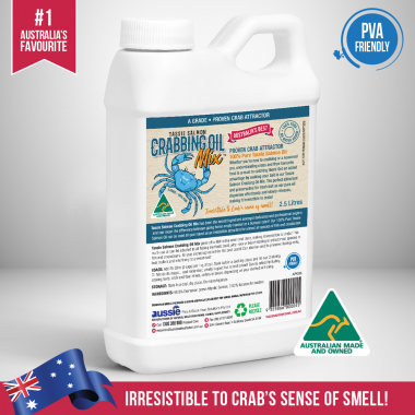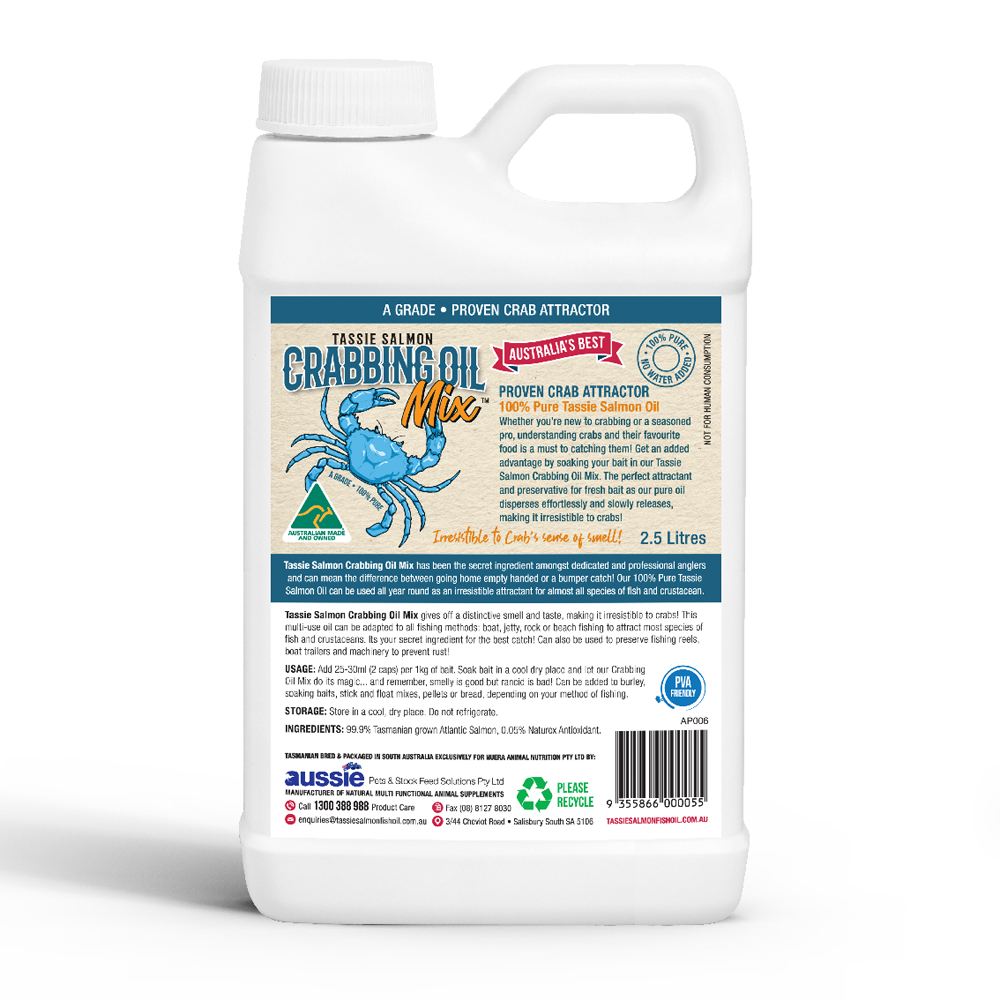 Use our irresistible Tassie Salmon Crabbing Oil Mix all year round. Its the perfect attractant to catch crabs, squid and most species of crustacean thanks to our effortlessly dispersing and slow release oil.