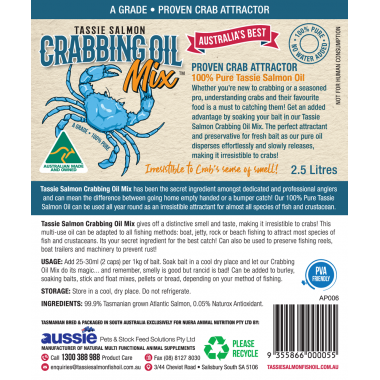 Our Tassie Salmon Crabbing Oil Mix Crabbing Attractant is sourced from 100% Tasmanian Atlantic Salmon farmed in the Pristine waters of Tasmania and produced in a state-of-the-art Salmon facility using Industrial high sustainable growing practices.