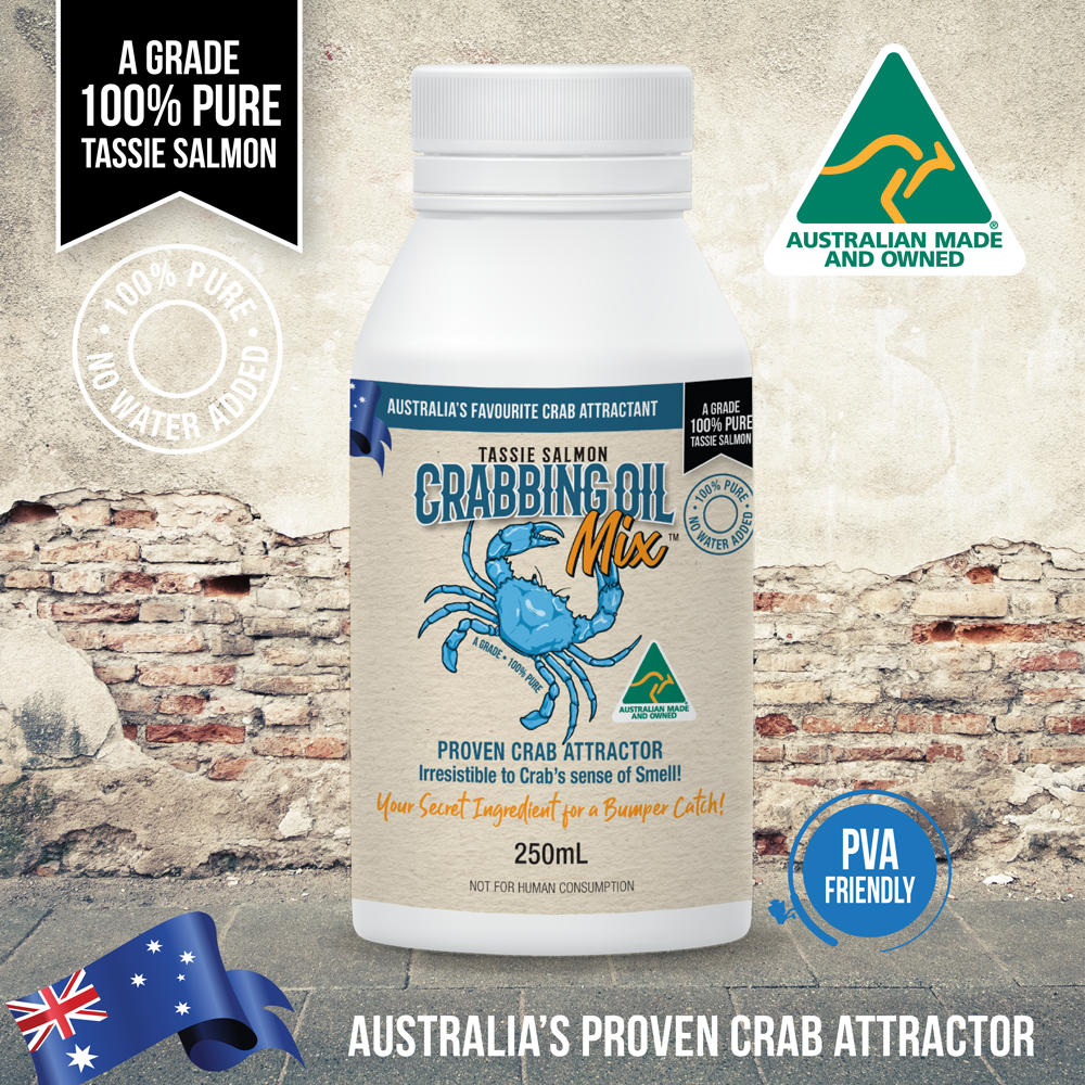 Use our irresistible Tassie Salmon Crabbing Oil Mix all year round. Its the perfect attractant to catch crabs, squid and most species of crustacean thanks to our effortlessly dispersing and slow release oil.