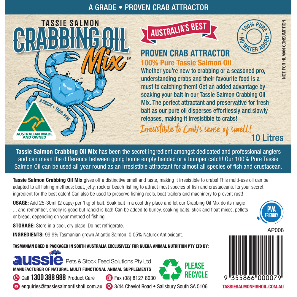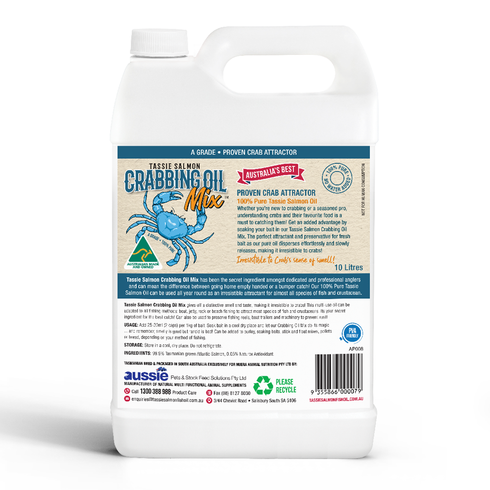 Our Tassie Salmon Crabbing Oil Mix Crabbing Attractant is sourced from 100% Tasmanian Atlantic Salmon farmed in the Pristine waters of Tasmania and produced in a state-of-the-art Salmon facility using Industrial high sustainable growing practices.