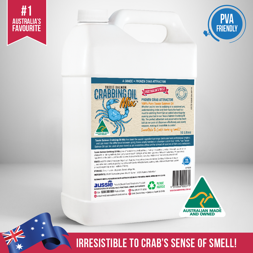 Use our irresistible Tassie Salmon Crabbing Oil Mix all year round. Its the perfect attractant to catch crabs, squid and most species of crustacean thanks to our effortlessly dispersing and slow release oil.