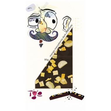 Australian grown dried mango with macadamia on dark chocolate. A melt in your mouth, vegan gourmet gift to savour. Limited edition artwork on packaging featuring illustration artist 13yo Miles.