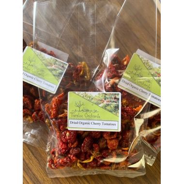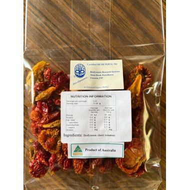 Ripe and vibrant-red (or yellow) biodynamic cherry tomatoes bursting with flavour are handpicked from our veggie patches. Slicing the tomatoes and laying them to dry until crisp creates these treats to eat as is, use on pizzas, quiches, in salads or on grazing plates.