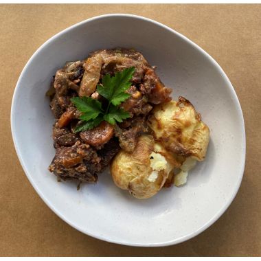 Beef slow cooked in loads of red wine and finished with roasted onions, mushrooms and chunks of celery and carrot. Serve with your favourite rice, pasta, salad, vegetables or crusty bread.