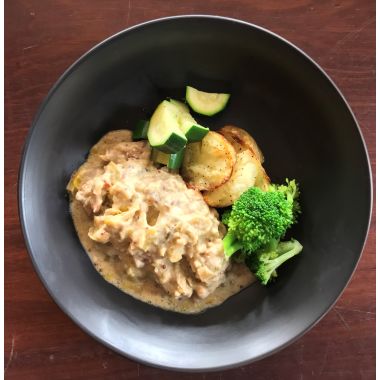 Chicken thighs slow cooked in onion and leek with cream, stock, dijon and seeded mustard. Serve with your favourite rice, pasta, salad, vegetables or crusty bread.