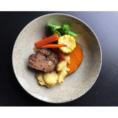 Slow cooked lamb with garlic and rosemary with traditional roast vegetables - potato, pumpkin, carrot, corn and broccoli. Complete meal