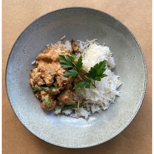 Traditional slow cooked Sri Lankan beef curry with fresh green vegetables finished with natural yoghurt. Serve with your favourite rice, pasta, salad, vegetables or crusty bread.