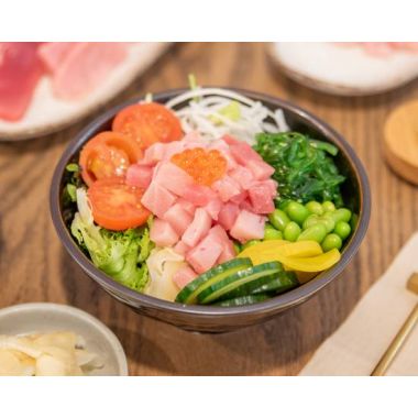 Southern Bluefin Tuna akami, chutoro and otoro sashimi with vegetables, pickled and sushi rice.