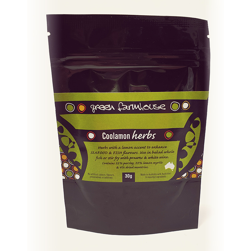 Coolamon Herbs uses Australian Native flavours, creating a green coloured seasoning resembling the sea. Use on seafood dishes, or when crumbing chicken schnitzel to add a vibrant Lemon Myrtle kick.