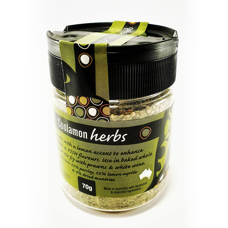 Coolamon Herbs uses Australian Native flavours, creating a green coloured seasoning resembling the sea. Use on seafood dishes, or when crumbing chicken schnitzel to add a vibrant Lemon Myrtle kick.