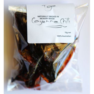 Hickory smoked dried cayenne chilli. Hot and tasty, a great gift for heat lovers! Used in cooking, it re-hydrates and softens. Or, grind it with a mortar and pestle into a powder and use it as a seasoning.