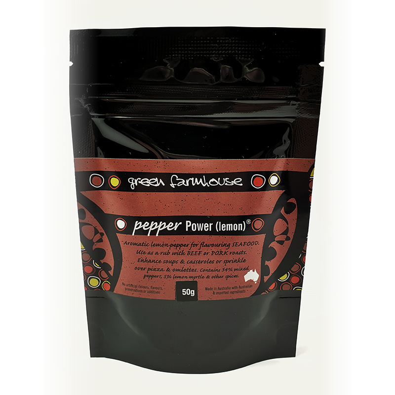 Pepper Power Lemon is an Australian Native seasoning blend containing lemon myrtle and lemon grass, along with three pepper varieties, perfect for seafood dishes.