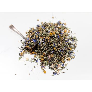Organic Guranse Green Tea (camellia sinensis) from Nepal, Organic Chamomile, Organic Lemon Balm, Organic Lemon Peel, Organic Lemongrass, Organic Lemon Verbena, Organic Elderflowers & Organic Cornflowers