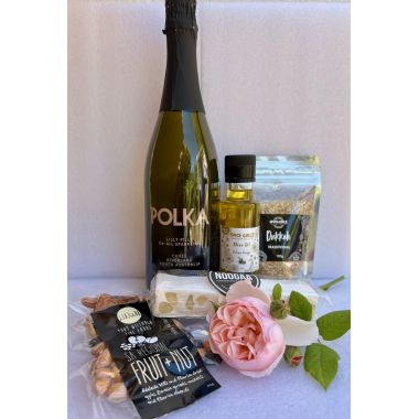 It begins with SA's own Polka non-alcoholic sparkling. Polka has created a taste of bubbly without any of the alcohol side effects. Make up a platter with Spice Girlz dukkah & olive oil, Port Willunga Fine Foods fruit & nut mix, and, for something sweet, a bar of macadamia Noogaa.