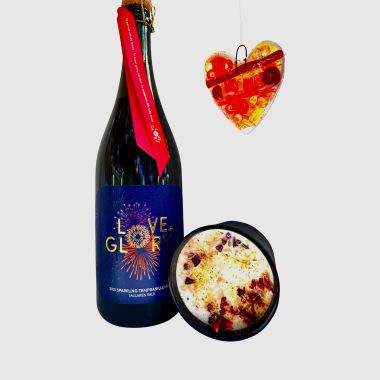 Add a bottle of Love & Glory Sparkling Temepranillo Rose, with Willow & Evie's Black Magic scented candle inlaid with amethyst and rose quartz.
