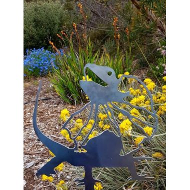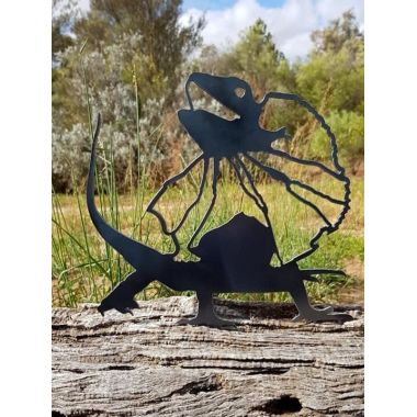 This charming Frilled-necked Lizard garden stake measures 269mm wide x 277mm high (plus 200mm stake on leg).
