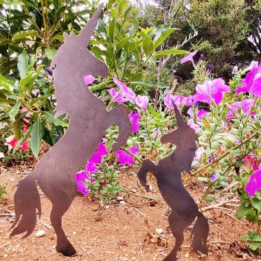 It has been designed and made by South Australians, created in 2mm mild steel which will naturally go Rusty unless you customize it by painting it! Why not add our mini unicorn garden stake keep it company?