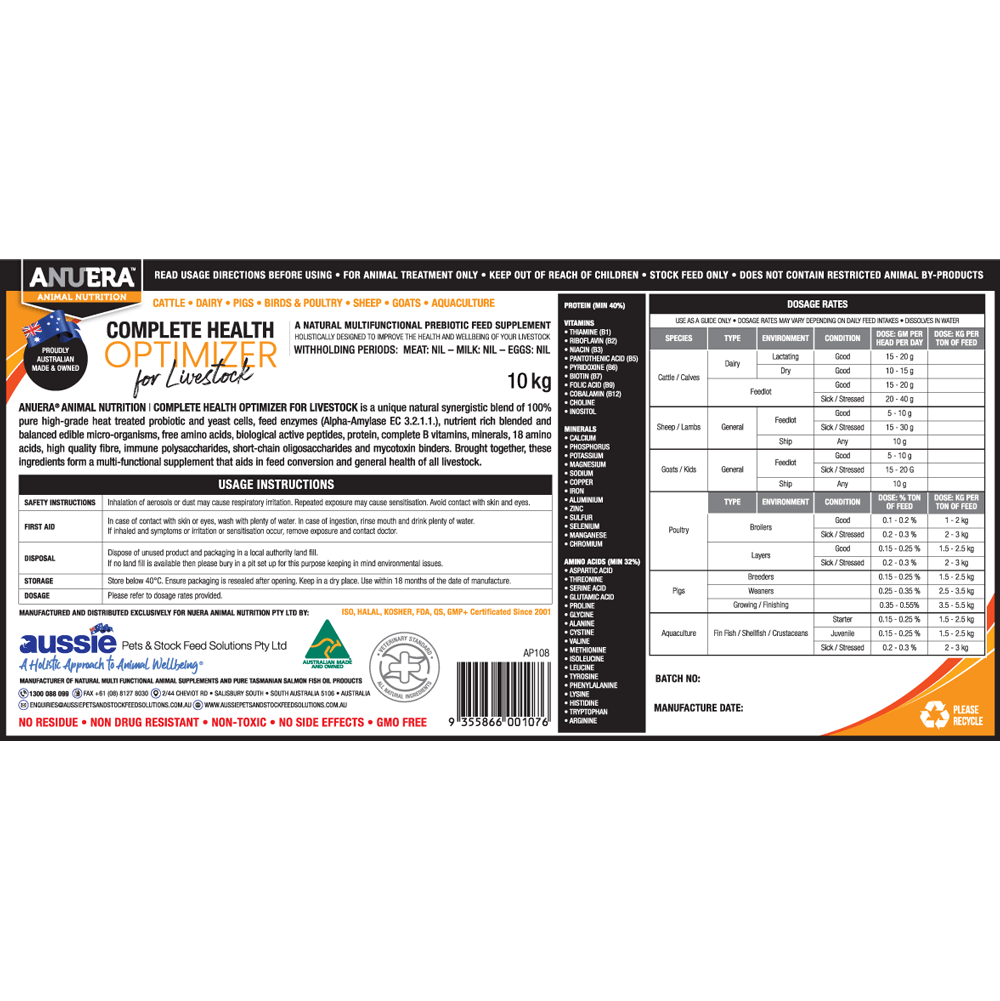 ANUERA® Complete Health Optimizer For Livestock is a unique natural synergistic blend of 100% pure high-grade heat treated probiotic and yeast cells, feed enzymes, nutrient rich blended and balanced edible micro-organisms, free amino acids, biological active peptides, protein, complete B vitamins, minerals, 18 amino acids, high quality fibre, immune polysaccharides, short-chain oligosaccharides and mycotoxin binders.