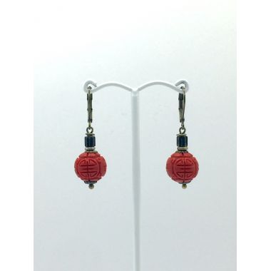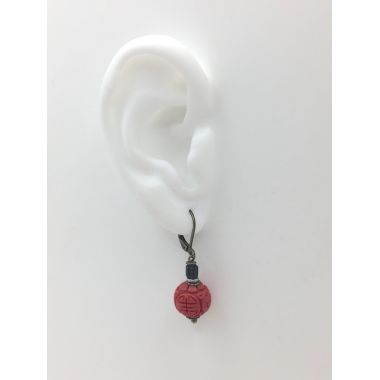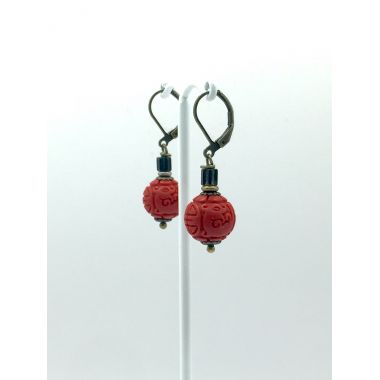 Real, Red Cinnabar, carved beads. 4 cm from top of nickel free brass, lever back ear hooks, to the bottom of beads.