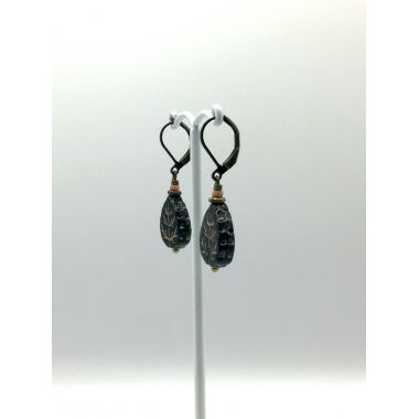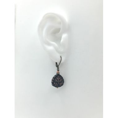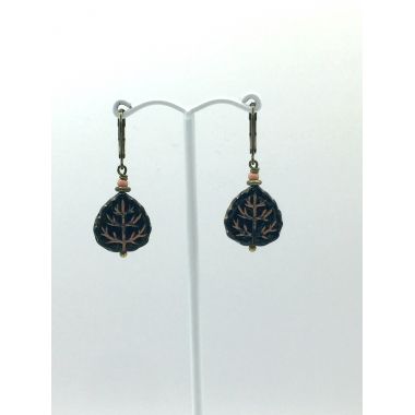 Black earrings in Czech glass; flat leaves with pink veins etched into the surface on both sides. 4 cm from top of nickel free lever back ear hook to the bottom of beads.