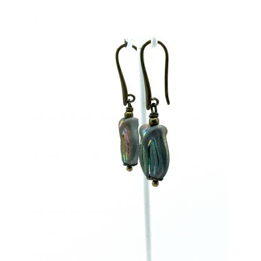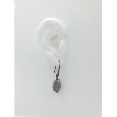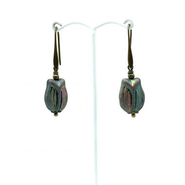 Very cute tulip Czech glass beads. They have a gorgeous matte rainbow lustre finish. Antiqued brass hooks.