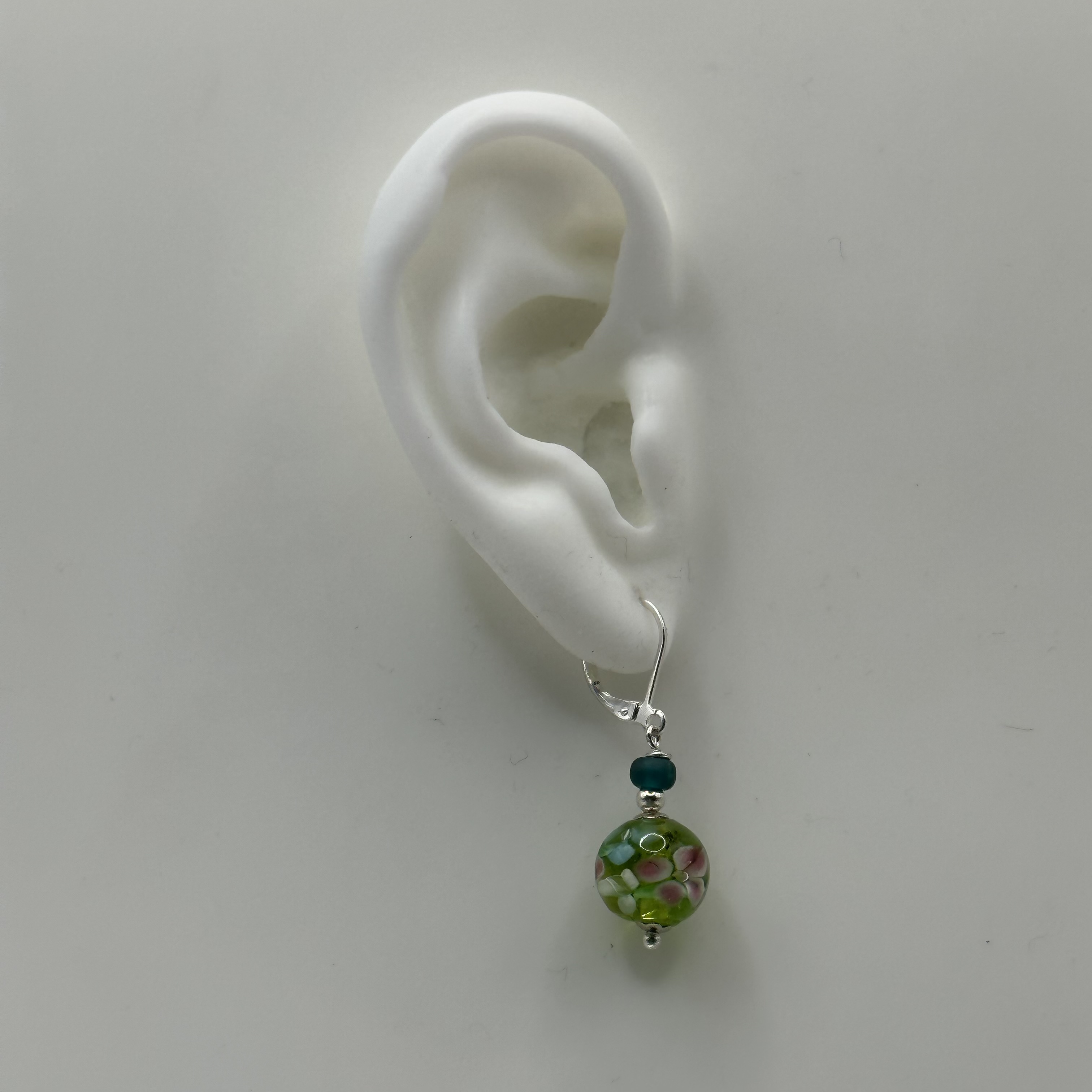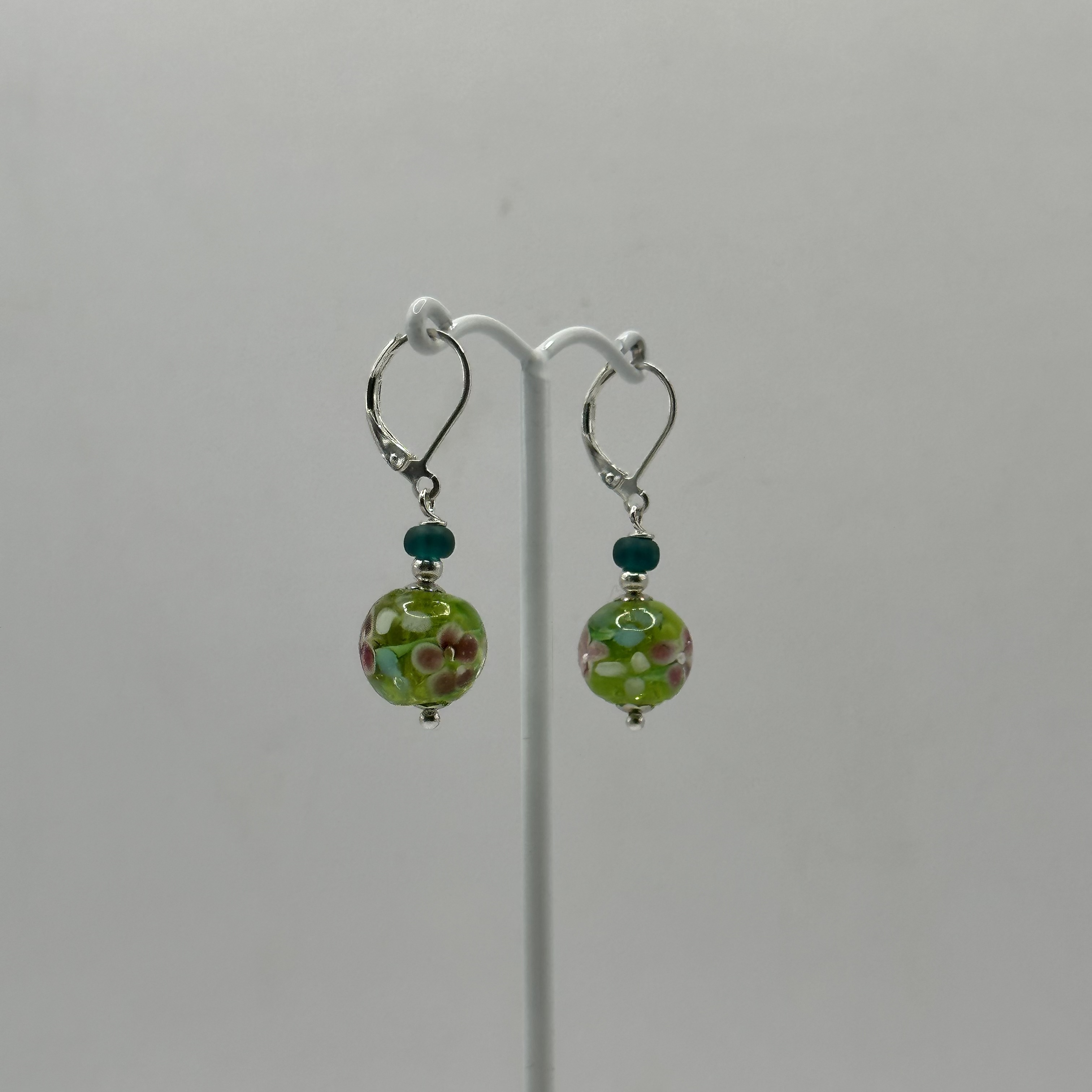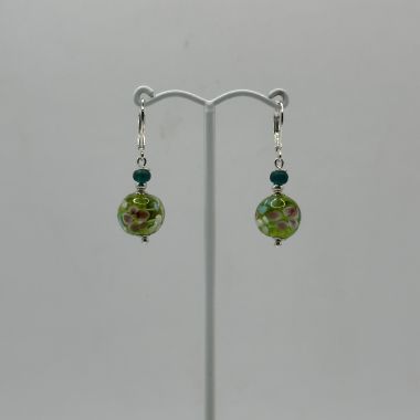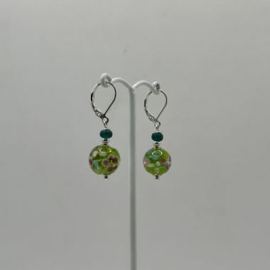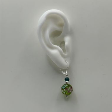Wonderful hand made glass bead earrings. These beautiful beads have a garden in their depths! Lovely, romantic flowers and leaves. Each earring measures 38mm from the top of the nickel free, secure lever back, ear hooks to the bottom of the gorgeous glass 12mm beads.