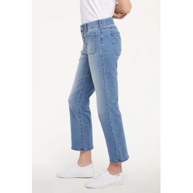 Designed to conform to you, NYDJ's Waist-Match™ Marilyn Straight Ankle Jeans have a magical satin elastic that lines the interior of the waistband and molds to your waist for an extra-comfortable fit. The timeless, best-selling silhouette falls straight from knee to ankle and pairs well with anything. The design also includes our Lift Tuck® Technology, which uses a proprietary slimming panel to flatten in front and flatter curves in back. Feels like a pull-on jean yet features a stylish four-button fly and patch pockets.