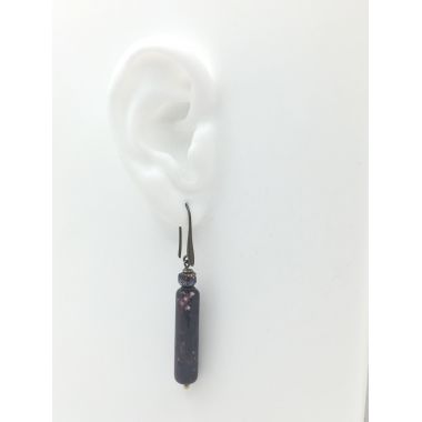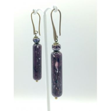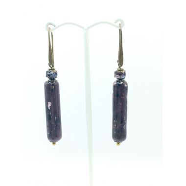 Vintage confetti lucite. These beads are purple & have black and tiny white speckles to look a bit like granite stone. There is a Czech glass crystal at the top. They measure 5.5 cm from top to base of beads.