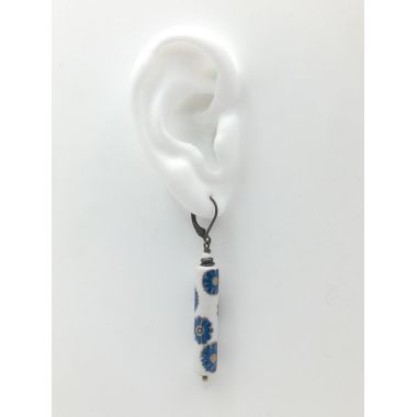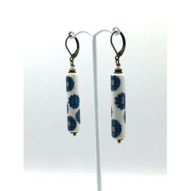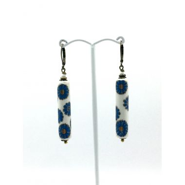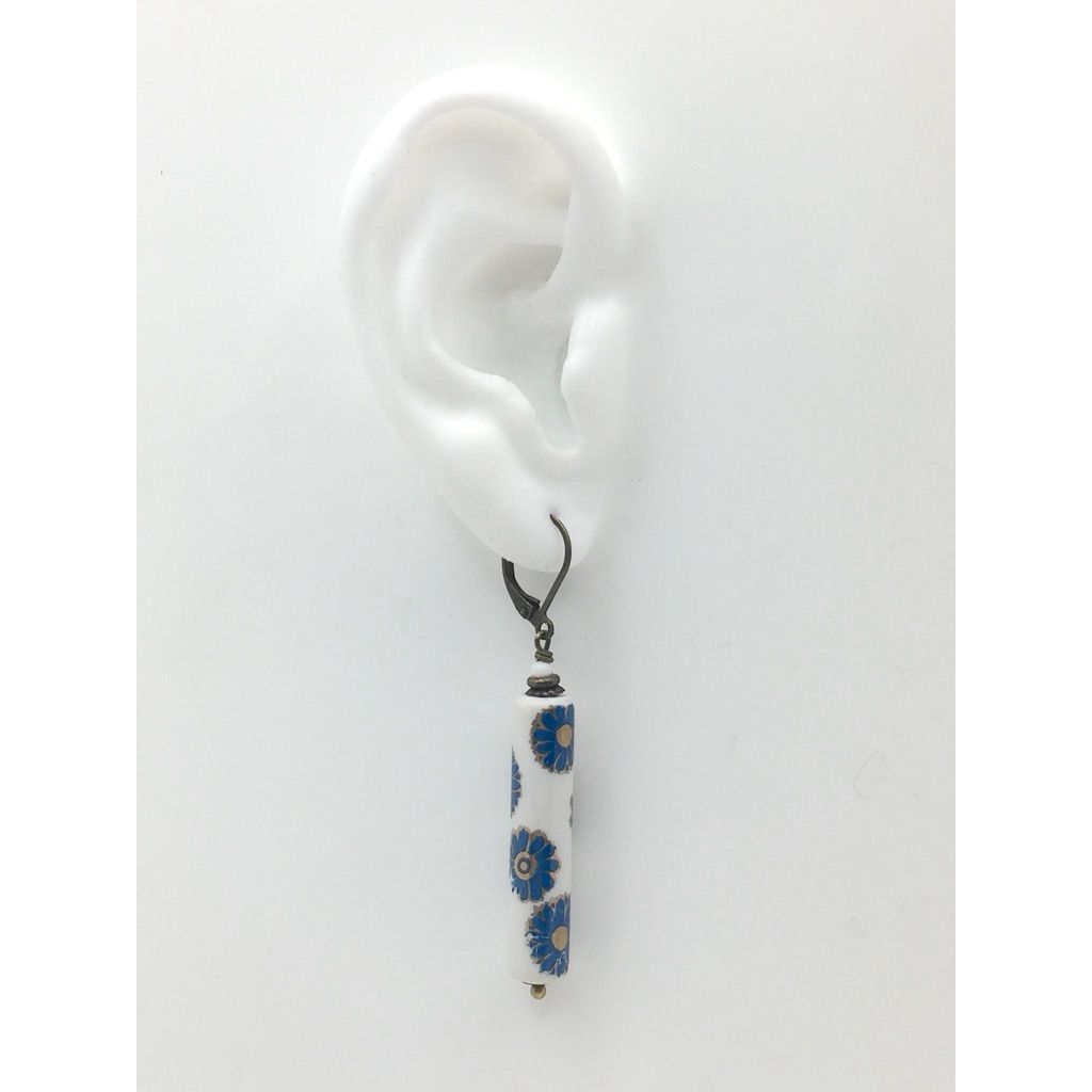 Vintage White Ceramic beads, decorated with blue daisies & highlighted with a gold outline. Very sweet and not a heavy earring. 6 cm from top of nickel free ear hook to bottom of beads.