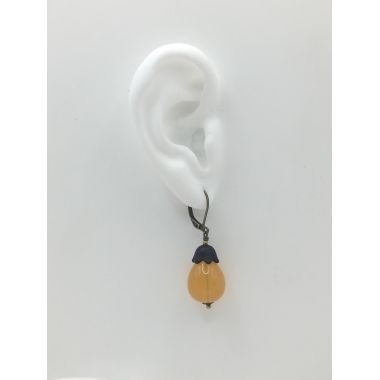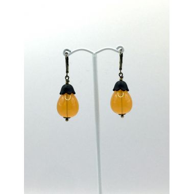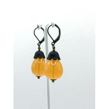 Gorgeous sunny golden, yellow lucite drop beads! They have a matte black flower bead cap, are light to wear, with no bubbles or seams in these beads. 4.5 cm from the top of the nickel free, lever back ear hook to the base of the beads.
