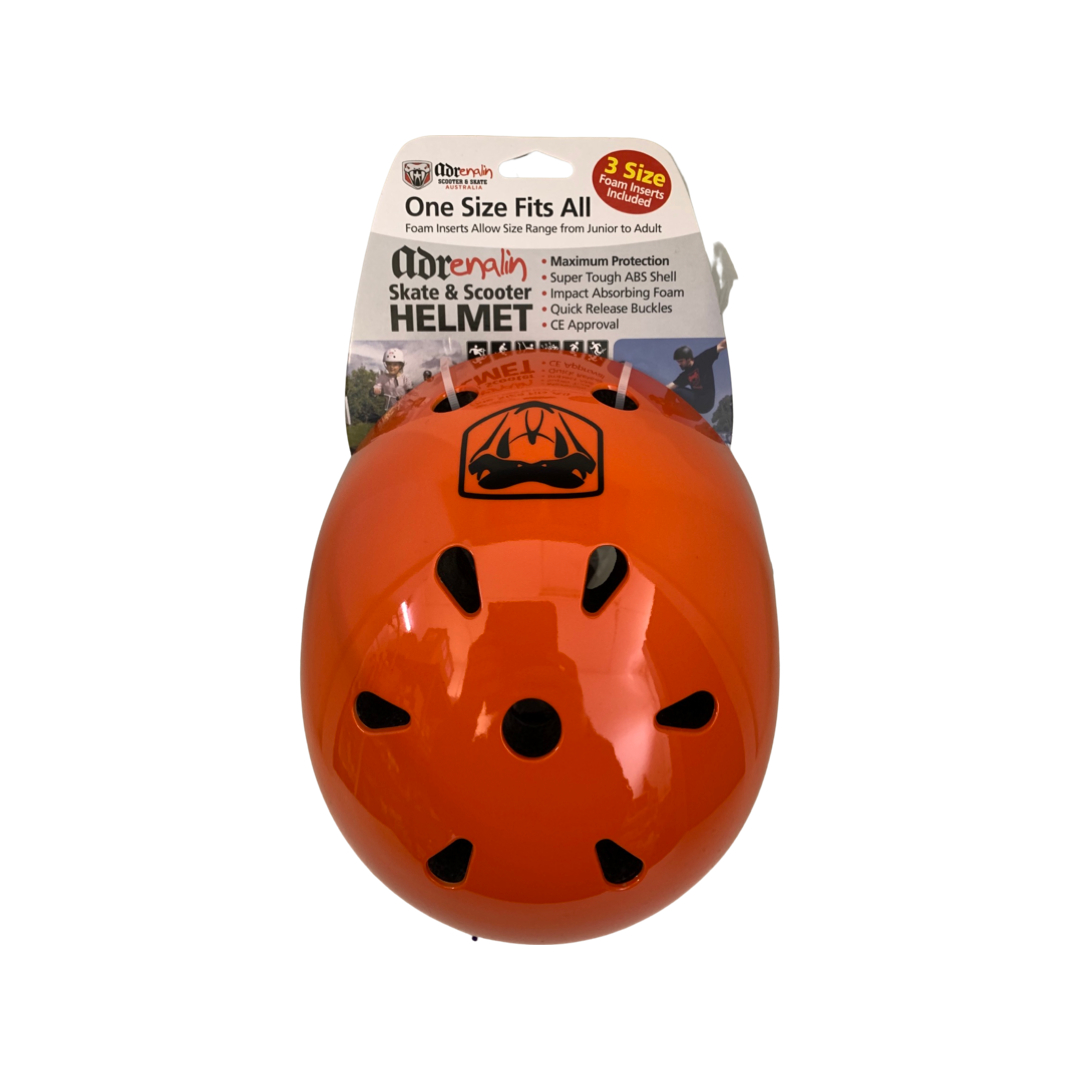 Adrenalin Skate and Scooter Helmet. One size fits all. Foam inserts allow size range from junior to adult. Maximum protection with a super tough ABS shell, impact absorbing foam and quick release buckles. CE approved. Color - Orange