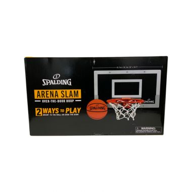 Spalding Arena Slam over-the-door mini backboard unit lets you sink a shot from any corner of the room. A quarter-scale replica of the official on-court backboard. Polycarbonate backboard. Mini ball included. Dimensions: 45.7cm x 26.7cm.